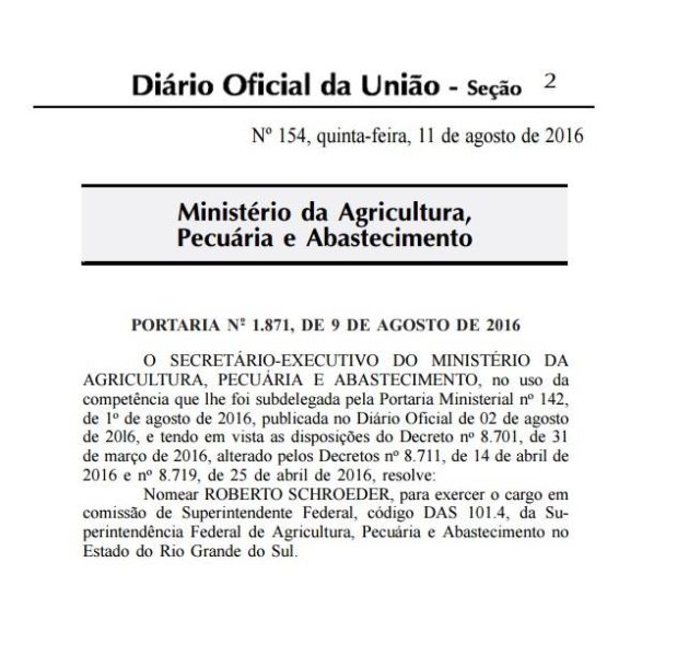 O auditor fiscal federal agropecuário Roberto Schroeder volta ao cargo de superintendente federal da Agricultura no Rio Grande do Sul exatamente seis meses depois de ter sido exonerado. O nome do médico veterinário foi publicado no Diário Oficial da União desta quinta-feira (11). Schroeder reassume para dar continuidade ao plano de trabalho iniciado e desenvolvido […]
