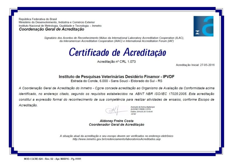 Os laboratórios do Instituto de Pesquisas Veterinárias Desidério Finamor (IPVDF) receberam o Certificado de Acreditação do Inmetro. Isso significa que a instituição poderá continuar credenciada ao Ministério da Agricultura para a realização de mais de 15 exames como doença de New Castle, peste suína clássica, brucelose e leptospirose. “A acreditação de laboratórios oficiais é fundamental […]