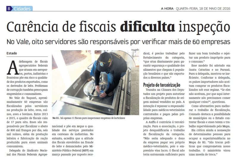18/05/2016 – A Hora: Carência de fiscais dificulta inspeçãonacional