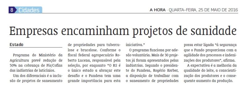 25/05/2016 – A Hora: Empresas encaminham projetos de sanidade