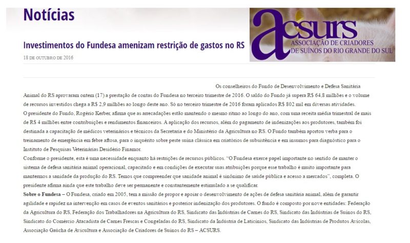 18/10/2016 – ACSURS: Investimentos do Fundesa amenizam restrição de gastos no RS