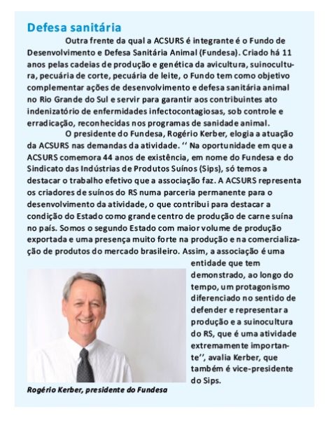 ACSURS INFORMA | PÁGINA 5 Outra frente da qual a ACSURS é integrante é o Fundo de Desenvolvimento e Defesa Sanitária Animal (Fundesa). Criado há 11 anos pelas cadeias de produção e genética da avicultura, suinocultura, pecuária de corte, pecuária de leite, o Fundo tem como objetivo complementar ações de desenvolvimento e defesa sanitária animal […]