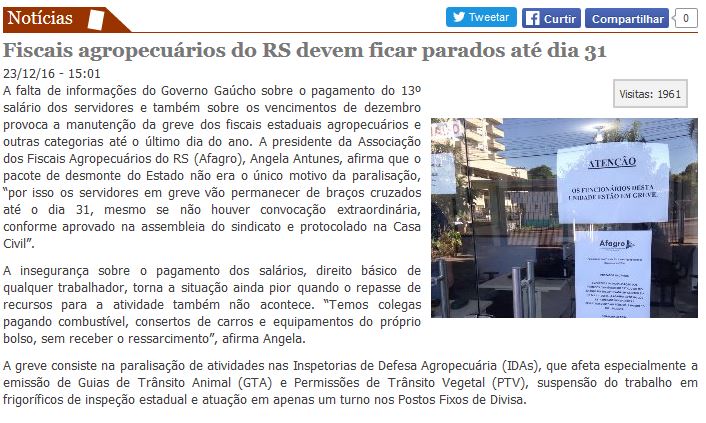 23/12/2016 – AgroLink: Fiscais agropecuários do RS devem ficar parados até dia 31