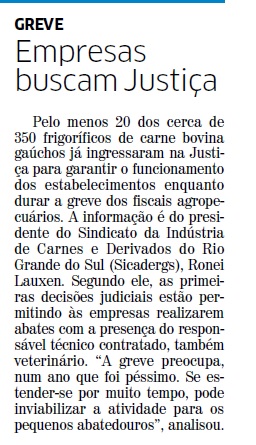 17/12/2016 – Poa 24 horas: Greve de fiscais agropecuários pode provocar falta de carne no Rio Grande do Sul