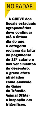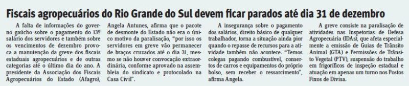ZERO HORA | CAMPO ABERTO | PÁGINA 15 A greve dos fiscais estaduais agropecuários deve continuar até o último dia do ano. A categoria reclama da falta de pagamento do 13° salário e vencimentos de dezembro. A greve afeta atividades como emissão de Guias de Trânsito Animal (GTAs) e inspeção em frigoríficos. Clique aqui para […]