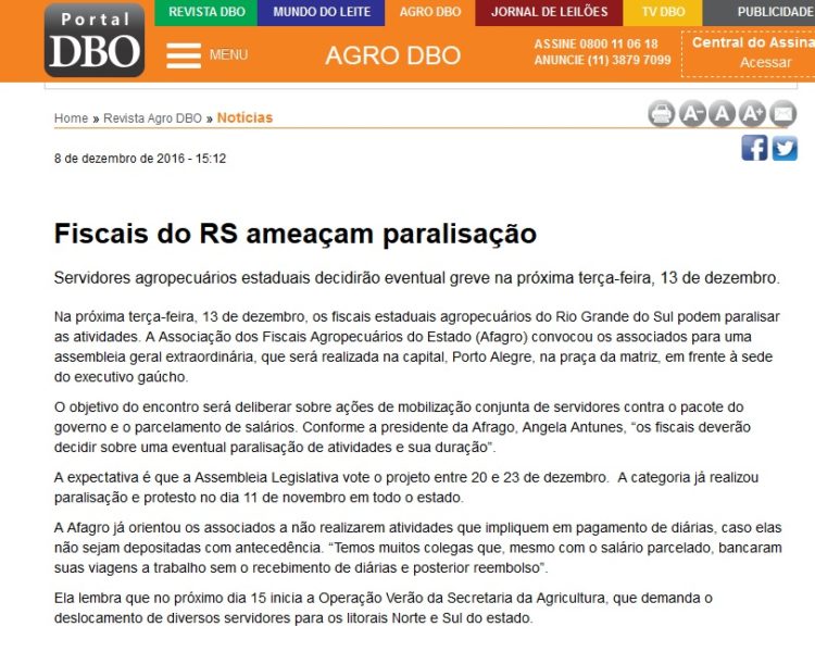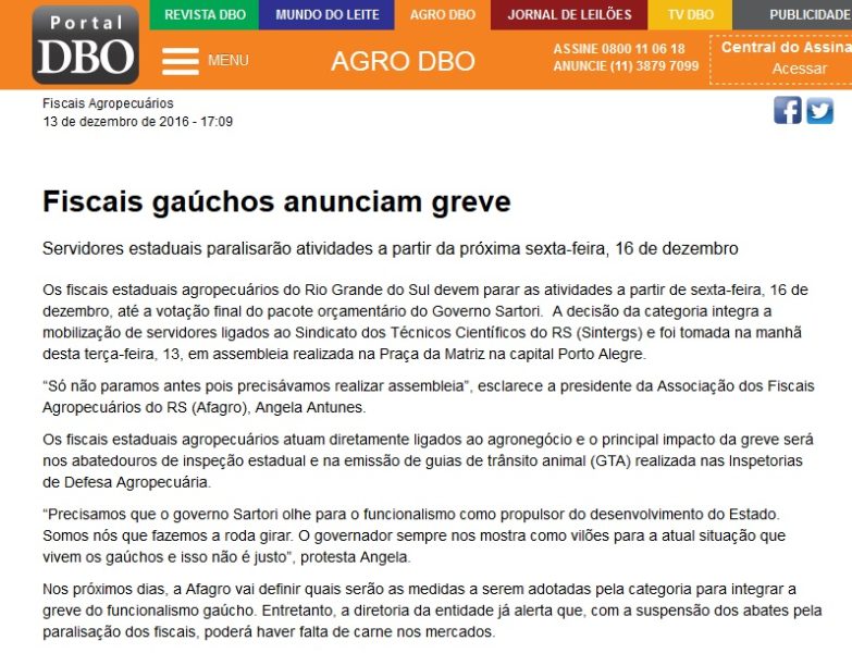 13/12/2016 – Portal DBO: Fiscais gaúchos anunciam greve