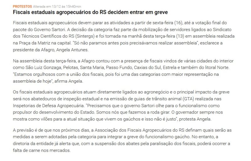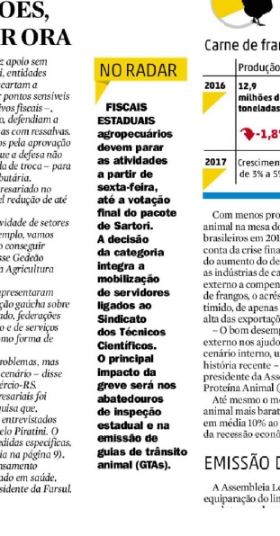 ZERO HORA | CAMPO ABERTO | PÁGINA 23 Fiscais Estaduais Agropecuários devem parar as atividades a partir de sexta-feira, até a votação final do pacote de Sartori. A decisão da categoria integra a mobilização de servidores ligados ao Sindicato dos Técnicos Científicos. O principal impacto da greve será nos abatedouros de inspeção estadual e na […]