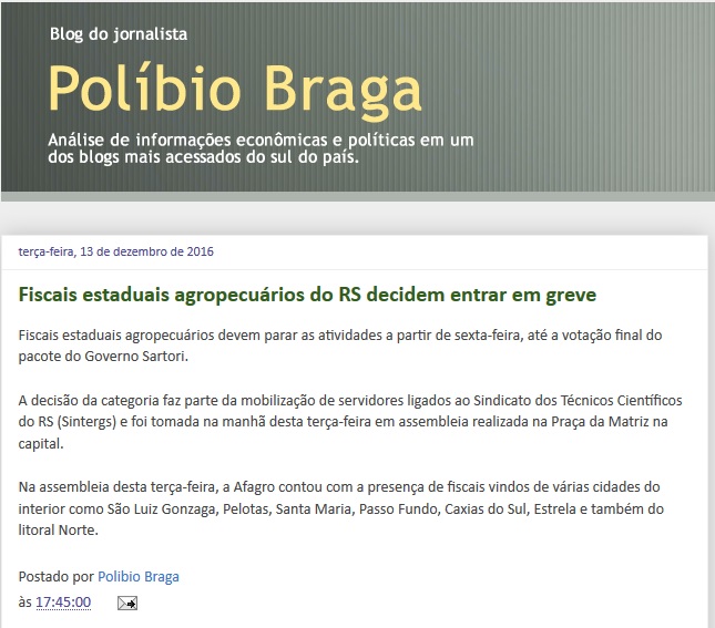 13/12/2016 – Políbio Braga: Fiscais estaduais agropecuários do RS decidem entrar em greve