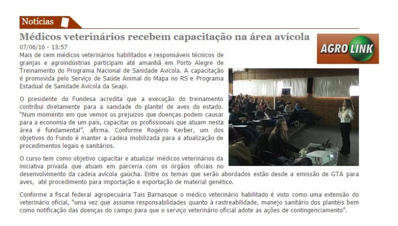 07/06/2016 – Agrolink: Médicos veterinários recebem capacitação na área avícola