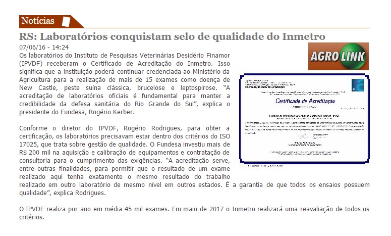 AGROLINK | ONLINE Os laboratórios do Instituto de Pesquisas Veterinárias Desidério Finamor (IPVDF) receberam o Certificado de Acreditação do Inmetro. Isso significa que a instituição poderá continuar credenciada ao Ministério da Agricultura para a realização de mais de 15 exames como doença de New Castle, peste suína clássica, brucelose e leptospirose. “A acreditação de laboratórios […]