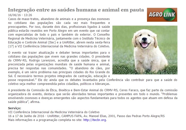 16/06/2016 – Agrolink: Integração entre as saúdes humana e animal em pauta