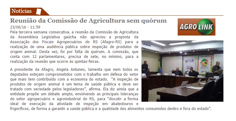 AGROLINK | ONLINE Pela terceira semana consecutiva, a reunião da Comissão de Agricultura da Assembleia Legislativa gaúcha não apreciou a proposta da Associação dos Fiscais Agropecuários do RS (Afagro-RS) para a realização de uma audiência pública sobre inspeção de produtos de origem animal. Desta vez, foi por falta de quórum. A comissão, que conta com […]