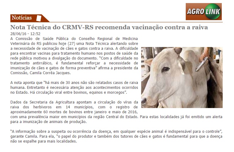 28/06/2016 – Agrolink: Nota Técnica do CRMV-RS recomenda vacinação contra a raiva