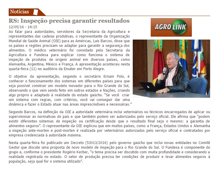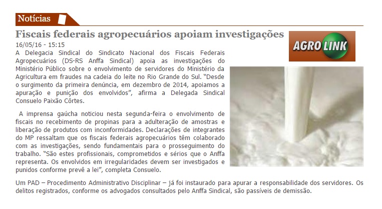 16/05/2016 – Agrolink: Fiscais federais agropecuários apoiam investigações