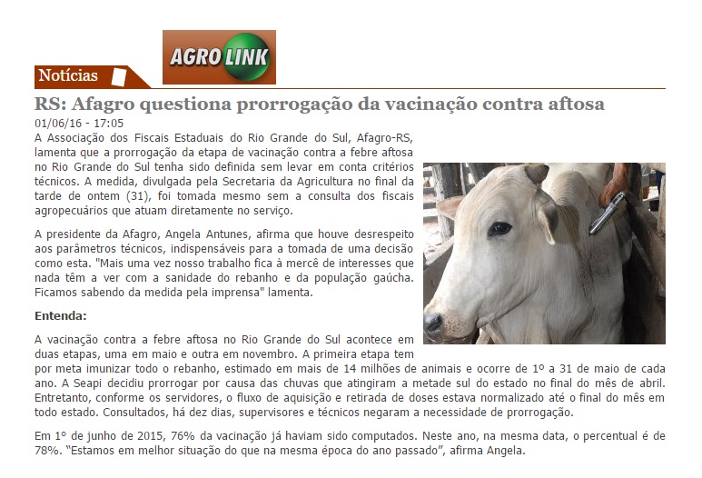 01/06/2016 – Agrolink: Afagro questiona prorrogação da vacinação contra aftosa