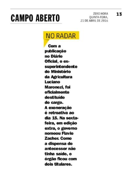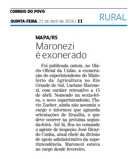 21/04/2016 – ZH: Ex-superintendente do Ministério da Agricultura, Luciano Maronezi, foi oficialmente destituído do cargo
