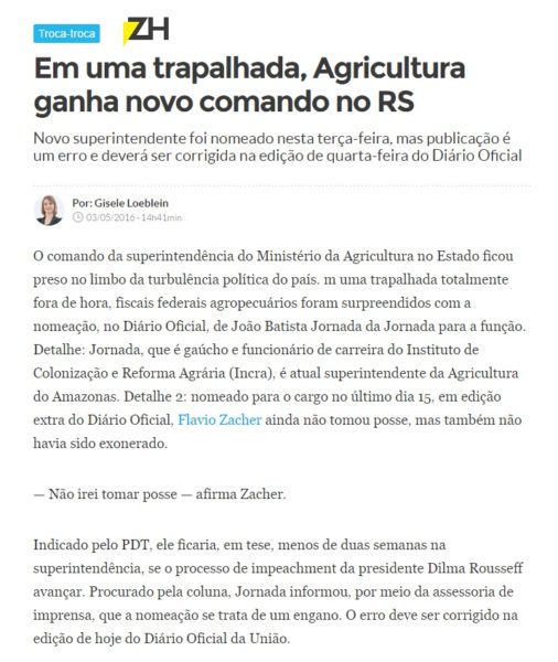 03/05/2016 – ZH: Em uma trapalhada, Agricultura ganha novo comando no RS