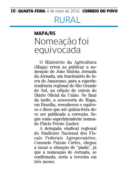 CORREIO DO POVO | RURAL | PÁGINA 10 O Ministério da Agricultura (Mapa) errou ao publicar a nomeação de João Batista Jornada da Jornada, um funcionário do Incra do Amazonas, para a superintendência regional do Rio Grande do Sul, na edição de ontem do Diário Oficial da União. No final da tarde, a assessoria do […]