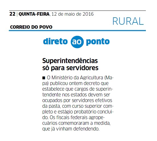 CORREIO DO POVO | RURAL | PÁGINA 22 O Ministério da Agricultura (Mapa) publicou ontem decreto que estabelece que cargos de superintendente nos estados devem ser ocupados por servidores efetivos da pasta, com curso superior completo e estágio probatório concluído. Os fiscais federais agropecuários comemoraram a medida, que já vinham defendendo. Clique aqui e confira […]