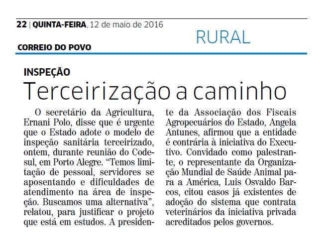 CORREIO DO POVO | RURAL | PÁGINA 22 O secretário da Agricultura, Ernani Polo, disse que é urgente que o Estado adote o modelo de inspeção sanitária terceirizado, ontem, durante reunião do Codesul, em Porto Alegre. “Temos limitação de pessoal, servidores se aposentando e dificuldades de atendimento na área de inspeção. Buscamos uma alternativa”, relatou, […]