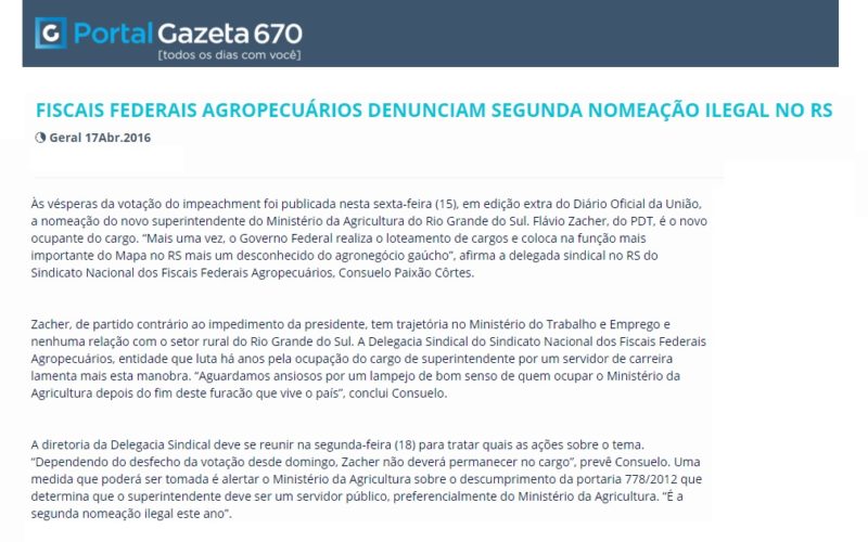 17/04/2016 – Portal Gazeta: Fiscais federais agropecuários denunciam segunda nomeação ilegal no RS