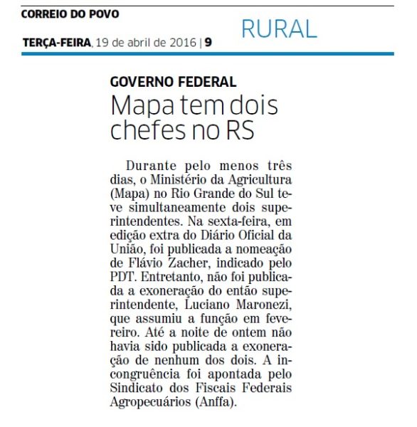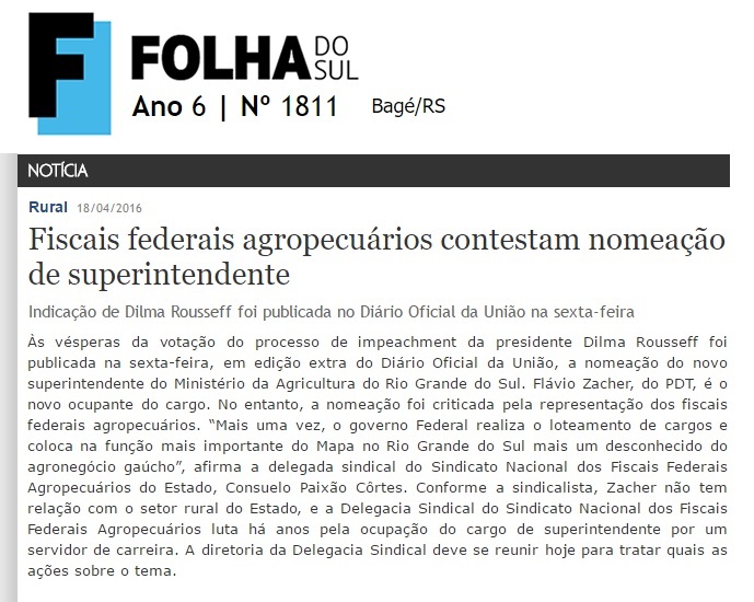 18/04/2016 – Folha do Sul: Fiscais federais agropecuários contestam nomeação de superintendente