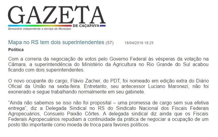 GAZETA DE CAÇAPAVA | ONLINE Com a correria da negociação de votos pelo Governo Federal às vésperas da votação na Câmara, a superintendência do Ministério da Agricultura no Rio Grande do Sul acabou ficando com dois superintendentes. O novo ocupante do cargo, Flávio Zacher, do PDT, foi nomeado em edição extra do Diário Oficial da […]