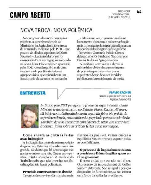 ZERO HORA | CAMPO ABERTO | PÁGINA 44 No compasso das movimentações políticas, a superintendência do Ministério da Agricultura teve troca de comando. Indicado pelo PTB – que passou de aliado a opositor de Dilma Rousseff –, Luciano Maronezi foi exonerado. Para seu lugar, foi nomeado na sexta-feira, Flavio Zacher, apontado pelo PDT. A mudança […]