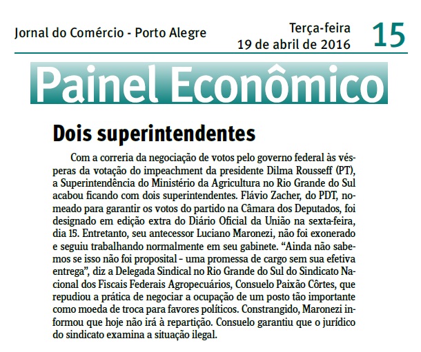 JORNAL DO COMÉRCIO | PAINEL ECONÔMICO | PÁGINA 15 Com a correria da negociação de votos pelo governo federal às vésperas da votação do impeachment da presidente Dilma Rousseff (PT), a Superintendência do Ministério da Agricultura no Rio Grande do Sul acabou ficando com dois superintendentes. Flávio Zacher, do PDT, nomeado para garantir os votos […]