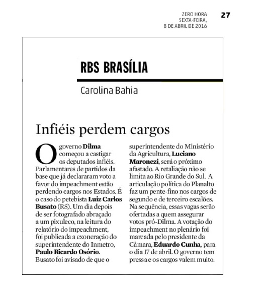 07/04/2016 – ZH: Favorável ao impeachment, Busato perde cargo no RS