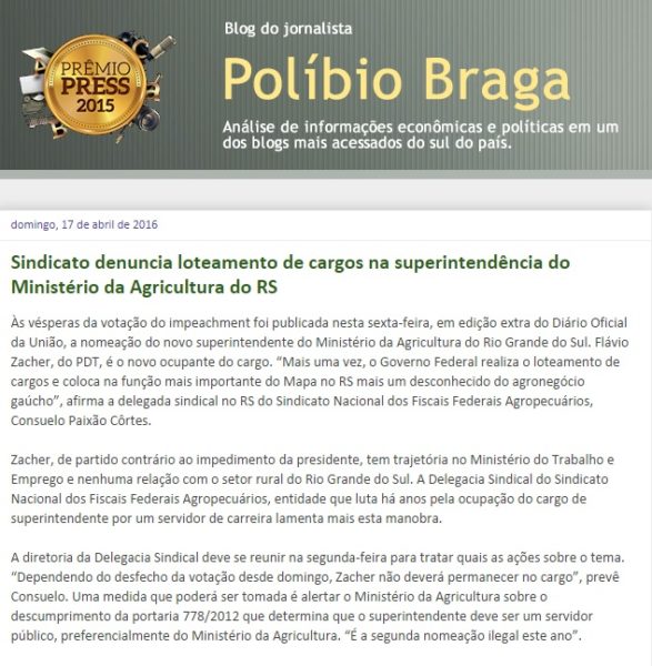17/04/2016 – Políbio Braga: Sindicato denuncia loteamento de cargos na superintendência do Ministério da Agricultura do RS