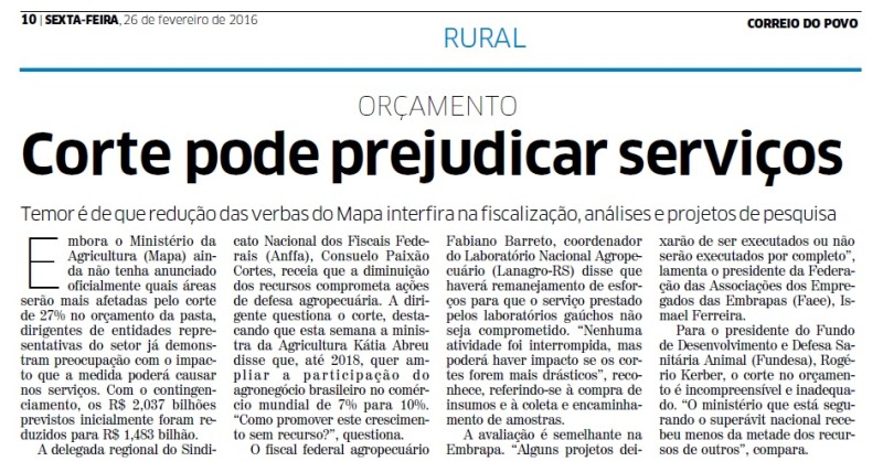 JORNAL DO COMÉRCIO | AGRONEGÓCIOS | PÁGINA 14 O Sindicato Nacional dos Fiscais Federais Agropecuários (Anffa Sindical) decide até sexta-feira a realização de uma paralisação nacional da categoria em apoio aos servidores gaúchos. A manifestação seria em protesto contra a indicação política do superintendente no Rio Grande do Sul. Luciano Maronezi foi nomeado no final […]
