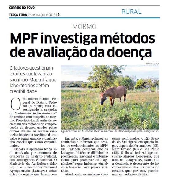 CORREIO DO POVO | RURAL | PÁGINA 9 Criadores questionam exames que levam ao sacrifício; Mapa diz que laboratórios detêm credibilidade O Ministério Público Federal do Distrito Federal (MPF/DF) está investigando a suspeita de “eutanásia indiscriminada” de equinos com suspeita de mormo. Proprietários de animais reclamam dos métodos de comprovação da doença usados pelos órgãos oficiais. […]