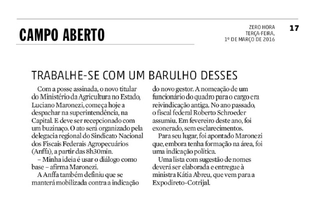 ZERO HORA | CAMPO ABERTO | PÁGINA 17 Com a posse assinada, o novo titular do Ministério da Agricultura no Estado, Luciano Maronezi, começa hoje a despachar na superintendência, na Capital. E deve ser recepcionado com um buzinaço. O ato será organizado pela delegacia regional do Sindicato Nacional dos Fiscais Federais Agropecuários (Anffa), a partir […]
