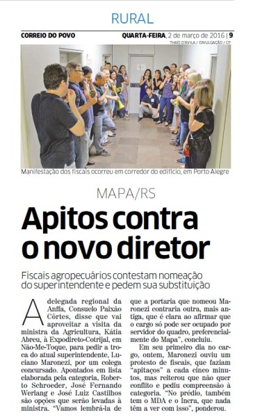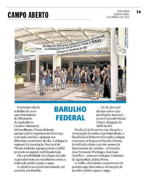ZERO HORA | CAMPO ABERTO | PÁGINA 16 O primeiro dia de trabalho do novo superintendente do Ministério da Agricultura, Luciano Maronezi, foi barulhento. Fiscais federais agropecuários organizaram buzinaço, cedo pela manhã, e apitaços em diferentes momentos do dia. A delegacia regional da Associação Nacional de Fiscais Federais Agropecuários (Anffa) promete se manter mobilizada hoje. […]