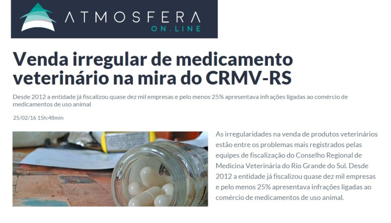 25/02/2016 – Atmosfera Online: Venda irregular de medicamento veterinário na mira do CRMV-RS