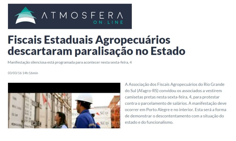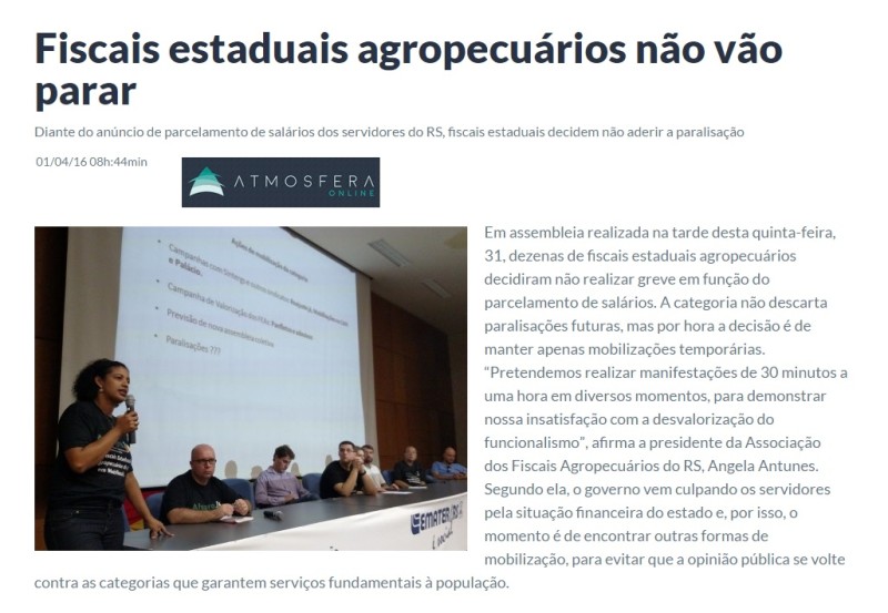 01/04/2016 – Atmosfera Online: Fiscais estaduais agropecuários não vão parar