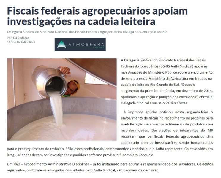 16/05/2016 – Atmosfera Online: Fiscais federais agropecuários apoiam investigações na cadeia leiteira