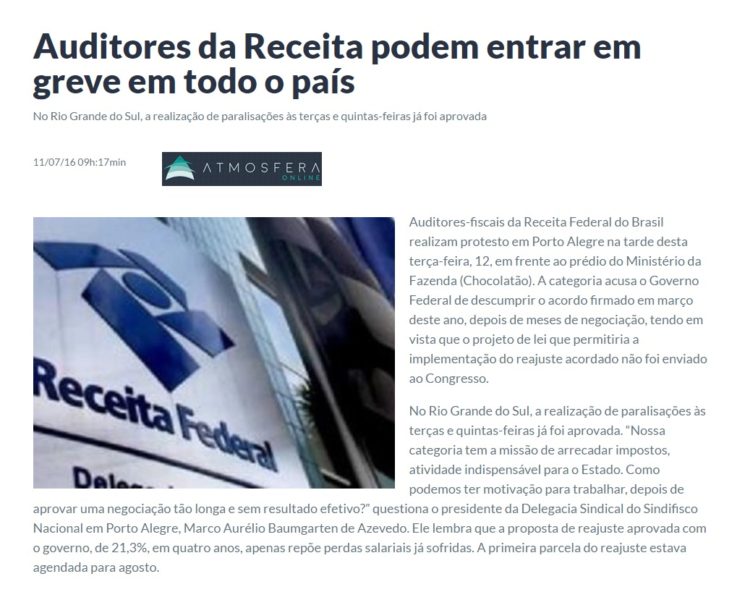 11/07/2016 – Atmosfera Online: Auditores da Receita podem entrar em greve em todo o país