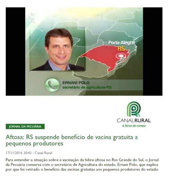 17/11/2016 – Canal Rural: Aftosa: RS suspende benefício de vacina gratuita a pequenos produtores