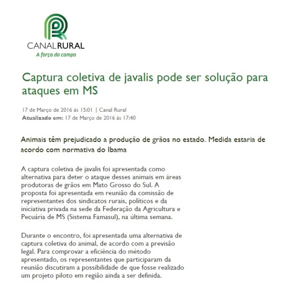 17/03/2016 – Canal Rural: Captura coletiva de javalis pode ser solução para ataques em MS