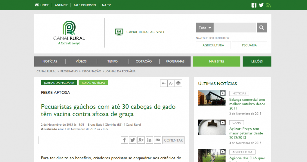 02/11/2015 – Canal Rural: Pecuaristas gaúchos com até 30 cabeças de gado têm vacina contra aftosa de graça