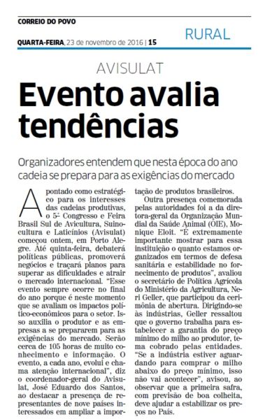 CORREIO DO POVO | RURAL | PÁGINA 15 Apontado como estratégico para os interesses das cadeias produtivas, o 5˚ Congresso e Feira Brasil Sul de Avicultura, Suinocultura e Laticínios (Avisulat) começou ontem, em Porto Alegre. Até quinta-feira, debaterá políticas públicas, promoverá negócios e traçará planos para superar as dificuldades e atrair o mercado internacional. “Esse […]