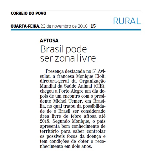 CORREIO DO POVO | RURAL | PÁGINA 15 Presença destacada no 5˚ Avisulat, a francesa Monique Eloit, diretora-geral da Organização Mundial da Saúde Animal (OIE), chegou a Porto Alegre um dia depois de um encontro com o presidente Michel Temer, em Brasília, no qual tratou da possibilidade de o Brasil ser considerado área livre de […]