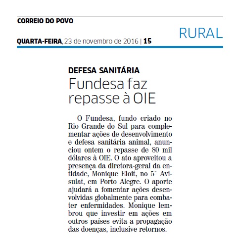 CORREIO DO POVO | RURAL | PÁGINA 15 O Fundesa, fundo criado no Rio Grande do Sul para complementar ações de desenvolvimento e defesa sanitária animal, anunciou ontem o repasse de 80 mil dólares à OIE. O ato aproveitou a presença da diretora-geral da entidade, Monique Eloit, no 5˚ Avisulat, em Porto Alegre. O aporte […]