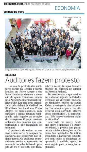 CORREIO DO POVO | ECONOMIA | PÁGINA 10 Um ato de protesto dos auditores fiscais da Receita Federal lotados em Porto Alegre e em Novo Hamburgo chamou a atenção de quem transitava ontem pelo Aeroporto Internacional Salgado Filho. Em uma ação organizada pela delegacia sindical do Sindifisco Nacional em Porto Alegre, os manifestantes, com cartazes […]