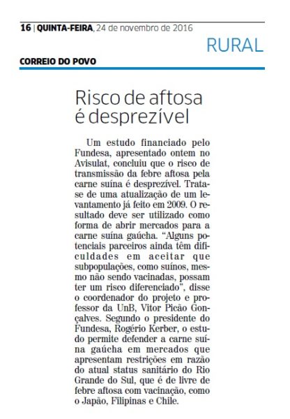 CORREIO DO POVO | RURAL | PÁGINA 16 Um estudo financiado pelo Fundesa, apresentado ontem no Avisulat, concluiu que o risco de transmissão da febre aftosa pela carne suína é desprezível. Tratase de uma atualização de um levantamento já feito em 2009. O resultado deve ser utilizado como forma de abrir mercados para a carne […]