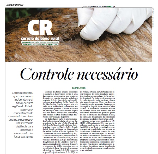 CORREIO DO POVO | CORREIO DO POVO RURAL | PÁGINAS 1, 2 E 3 Estudo constatou que, mesmo com incidência geral baixa, existem regiões do Estado com maior concentração de casos de tuberculose bovina,o que requer um sistema de vigilância para detecção e saneamento dos focos existentes Zoonose de grande impacto econômico e sanitário, a […]