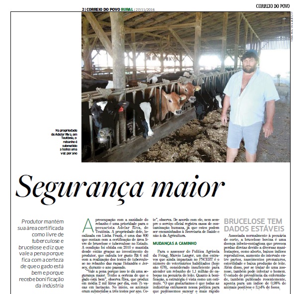 CORREIO DO POVO | CORREIO DO POVO RURAL | PÁGINAS 1, 2 E 3 Produtor mantém sua área certificada como livre de tuberculose e brucelosee diz que vale a pena porque fica com a certeza de que o gado está bem e porque recebe bonificação da indústria A preocupação com a sanidade do rebanho é […]
