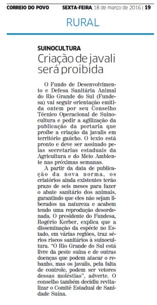 CORREIO DO POVO | RURAL | PÁGINA 19 O Fundo de Desenvolvimento e Defesa Sanitária Animal do Rio Grande do Sul (Fundesa) vai seguir orientação emitida ontem por seu Conselho Técnico Operacional de Suinocultura e pedir a agilização da publicação da portaria que proíbe a criação da javalis em território gaúcho. O texto está pronto […]